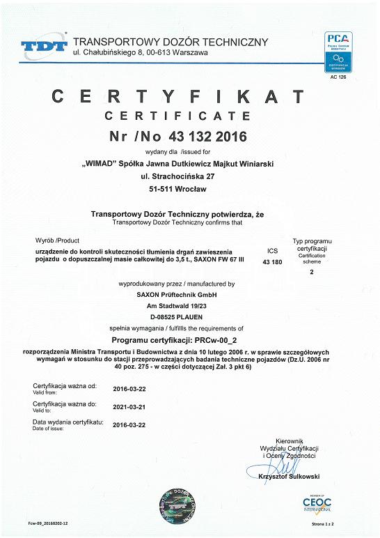 - urządzenie do kontroli skuteczności tłumienia drgań zawieszenia pojazdu o dmc do 3,5 tony SAXON FW 67 III uzyskało certyfikat TDT nr 43 132 2016