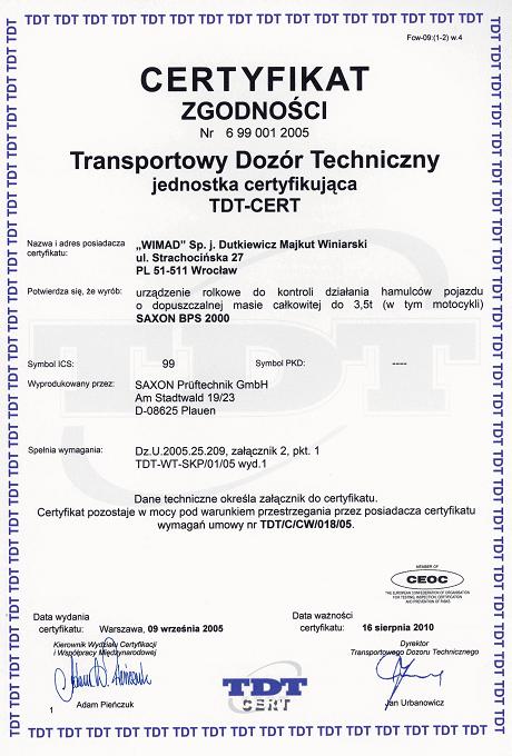 Urządzenie rolkowe do kontroli działania hamulców pojazdu o dopuszczalnej masie całkowitej do 3,5 tony, w tym motocykli – SAXON BPS 2000 – certyfikat nr 6 99 001 2005: