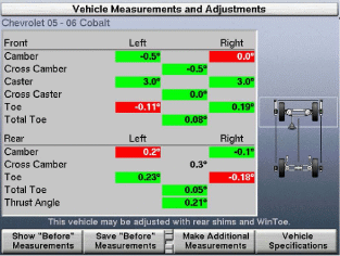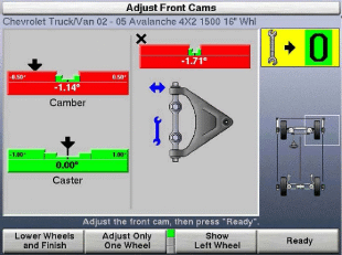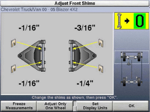 CAMM (Control Arm Movement Monitor) – funkcja umożliwiająca regulację kąta pochylenia koła oraz kąta wyprzedzenia sworznia zwrotnicy przy pomocy mimośrodów lub podłużnych otworów regulacyjnych na wahaczu poprzecznym. Zawiera 3 podstawowe ustawienia mające zastosowanie dla ponad 30% pojazdów aktualnie poruszających się po drogach. Porównując aktualne pomiary z danymi producenta, CAMM monitoruje ruch wahacza i z bardzo dużą dokładnością określa jak daleko i w którym kierunku wymagane jest przesunięcie końca wahacza. Ponieważ wszystkie ruchy wahacza natychmiast przedstawiane są na ekranie, technik może łatwo stwierdzić kiedy położenie wahacza jest prawidłowe. CAMM oblicza także ile podkładek powinno zostać dodanych lub usuniętych, aby skorygować ustawienie. Zwiększa efektywność pracy technika. Rysunek powyżej: Obliczanie grubości podkładek dystansowych przez program.Rysunek powyżej: Pełna kontrola wartości kątów pochylenia i wyprzedzenia przy ustawieniach wahacza górnego.