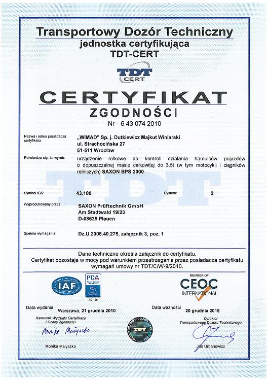 Z przyjemnością informujemy Państwa, że 20 grudnia 2010 sprzedawane przez naszą firmę urządzenie rolkowe do kontroli działania hamulców pojazdu o dopuszczalnej masie całkowitej do 3,5 t (w tym motocykli i ciągników rolniczych) SAXON BPS uzyskało certyfikaty Transportowego Dozoru Technicznego nr 6 43 074 2010.