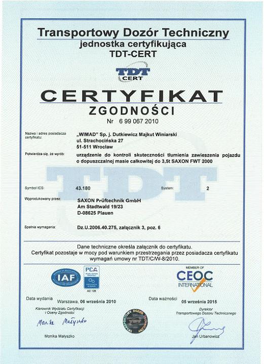 Wcześniej, 6 września 2010 certyfikat o numerze 6 99 067 2010 uzyskało urządzenie do kontroli skuteczności tłumienia zawieszenia pojazdu o dopuszczalnej masie całkowitej do 3,5 t, wyposażone w płyty przesuwne