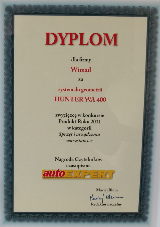 Z przyjemnością informujemy Państwa, że sprzedawany przez naszą firmę komputerowy system kontroli i regulacji geometrii kół i osi pojazdów HUNTER WA400 z kamerami HS Elite został PRODUKTEM ROKU 2011 w kategorii sprzęt i urządzenia warsztatowe!