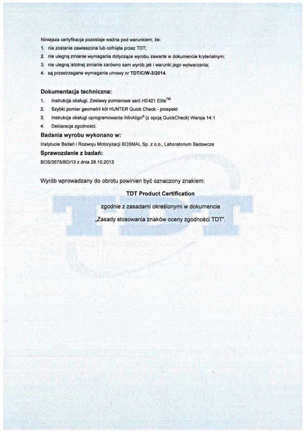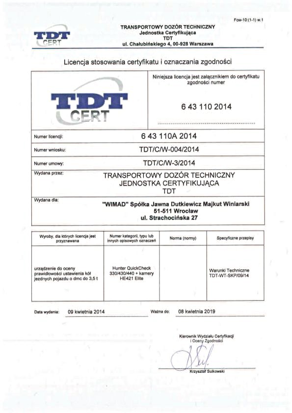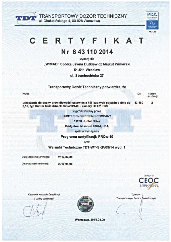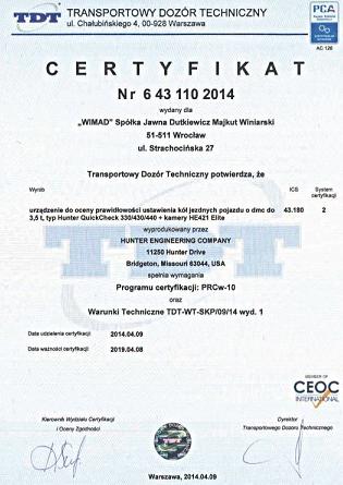 Informujemy Państwa, że sprzedawany przez naszą firmę system do szybkiego pomiaru geometrii ustawienia kół i osi pojazdów HUNTER QuickCheck 330/430/440 z kamerami HE421 Elite uzyskał w Transportowym Dozorze Technicznym certyfikat numer 6 43 110 2014. Dokument ten świadczy o wiarygodności urządzenia. Dodatkowo przypominamy, ze dla stacji kontroli pojazdów przeznaczony jest kompletny system HUNTER WA 330/430/440 z kamerami HE421 Elite posiadający certyfikat TDT 6 43 104 2013.